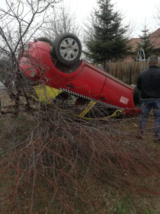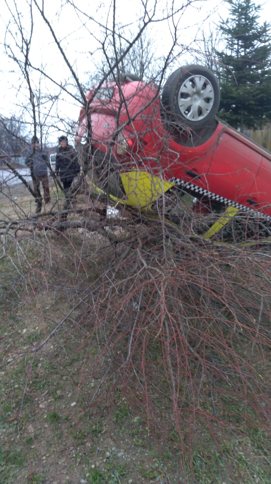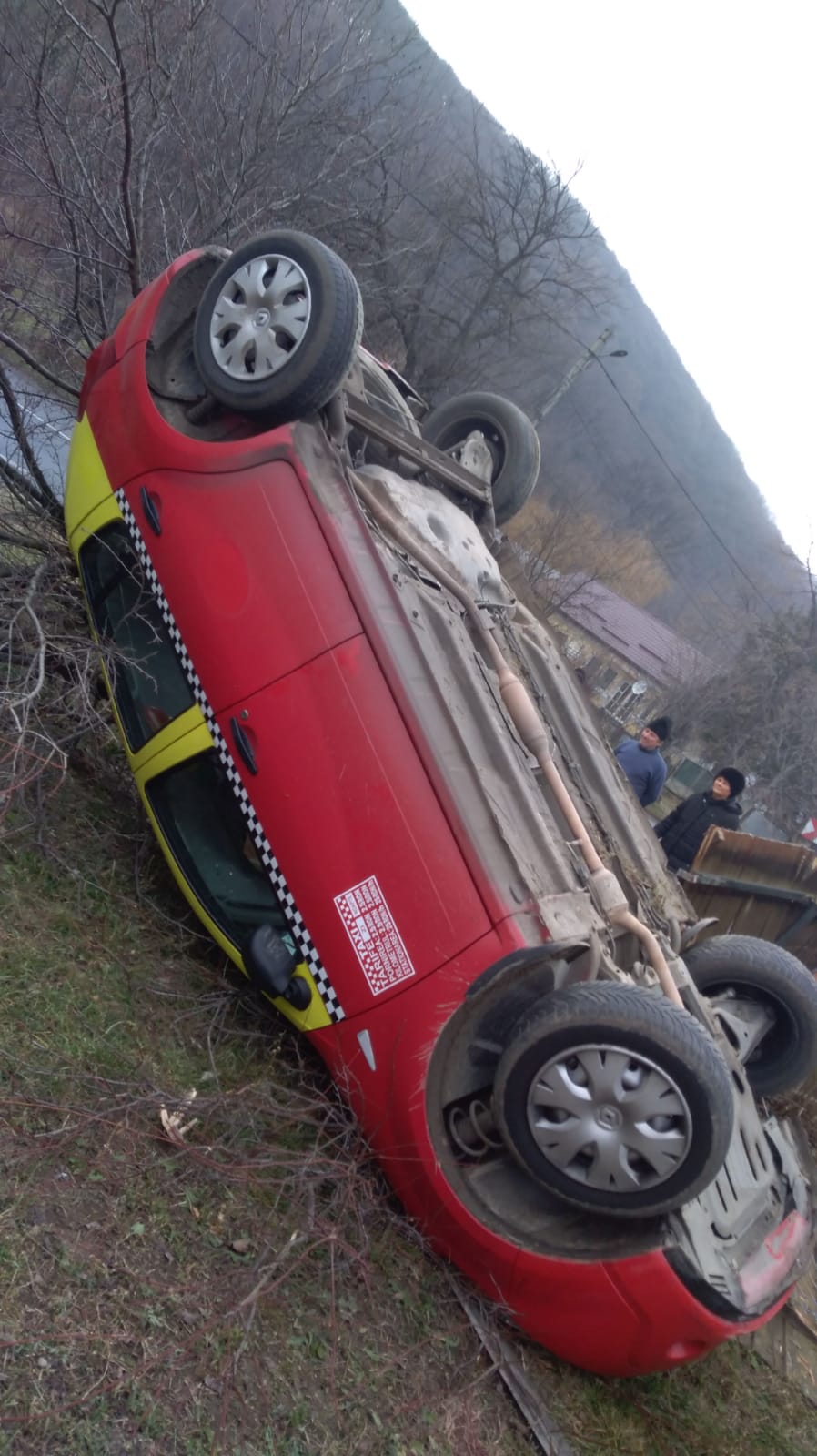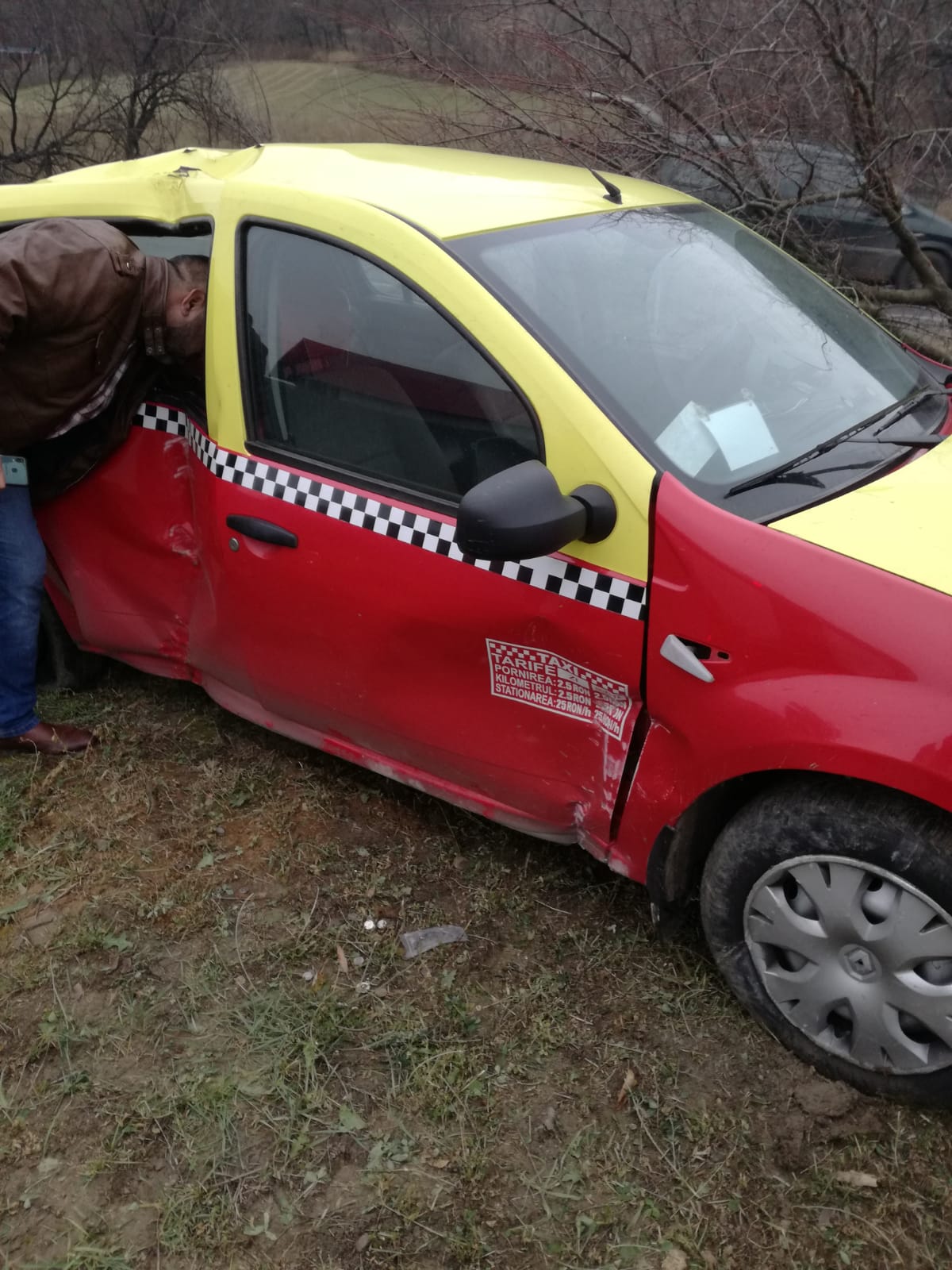 Un taxi a ieșit în afara părții carosabile și s-a răsturnat pe un copac.