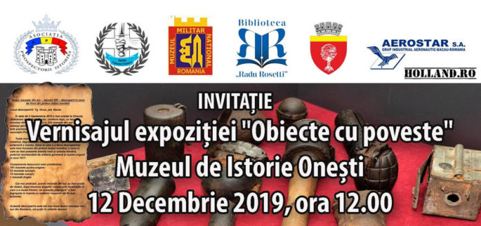 La Muzeul de Istorie din Onești, joi, 12 decembrie, de la ora 12.00 va fi vernisată expoziția „Obiecte cu poveste”, obiecte descoperite pe frontul Primului Război Mondial în județul Bacău. Organizatorul expoziției este Asociația „Prospectorii Istoriei”, din Comănești, în parteneriat cu Asociația Regimentul 15 Infanterie din Iași, cu Muzeul Militar Național Român, cu Biblioteca „Radu Rosetti” din Onești, cu Municipiul Onești și cu societățile Aerostar și asociația Holland.ro
