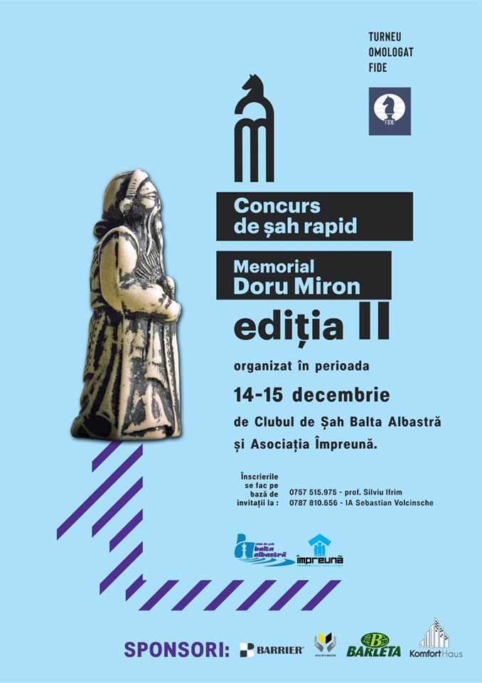 Sâmbătă, 14 decembrie, Clubul de Șah „Balta Albastră”, în colaborare cu pensiunea cu același nume din comuna Letea, a dat startul în concursul de șah activ „MEMORIAL DORU MIRON‟, ediția a II-a. Concursul va avea loc în zilele de 14 și 15 decembrie și face din Bacău o veritabilă capitală a acestui sport al minții.