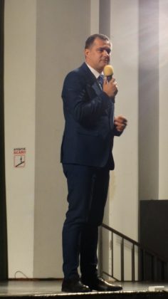 Sorin Braşoveanu, absolvent al Şcolii Populare de Arte şi Meserii, cu mulţi ani în urmă, a împărtăşit celor prezenţi momente frumoase, experienţa dobândită, aducând un omagiu foştilor lui profesori, printre care Gheorghe Pătrar şi Florin Zăncescu. „Aveţi o misiune plăcută, în acelaşi timp şi foarte importantă, de pregătire, de perfecţionare şi valorificare a talentelor, fie ei copii, tineri sau maturi. Sunt bucuros să mă aflu astăzi aici şi să vă transmit cele mai frumoase urări şi să vă felicit pe toţi, profesori şi elevi deopotrivă”, a spus emoţionat Sorin Braşoveanu, şi pentru a arăta că perioada cât a fost cursant i-a folosit, a recitat o poezie de Ion Minulescu, fiind aplaudat de publicul prezent. În semn de preţuire şi apreciere, a înmânat directorului acestei instituţii, Olguţa Pâţu, Diploma de Excelenţă a Consiliului Judeţean, cu ocazia împlinirii a 65 de ani, pentru întreaga activitate. La rândul ei, Olguţa Pâţu i-a acordat preşedintelui Consiliului Judeţean Diploma şi placheta aniversară, pentru sprijinul permanent acordat acestei instituţii de învăţământ şi cultură, împreună cu mici obiecte de artă realizate de elevii şcolii, cât şi o ie foarte frumoasă, operă a artistului popular Marian Lungu, pe care, Sorin Braşoveanu, în aplauzele publicului, a şi îmbrăcat-o pe scenă.