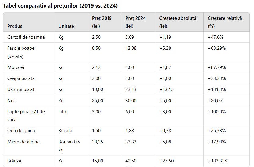 Comparând datele din noiembrie 2019 cu cele din noiembrie 2024, observăm o tendință clară de scumpire pe tot spectrul produselor analizate. Creșterile variază între +17,98% (mierea de albine) și +183,33% (brânza de oaie).