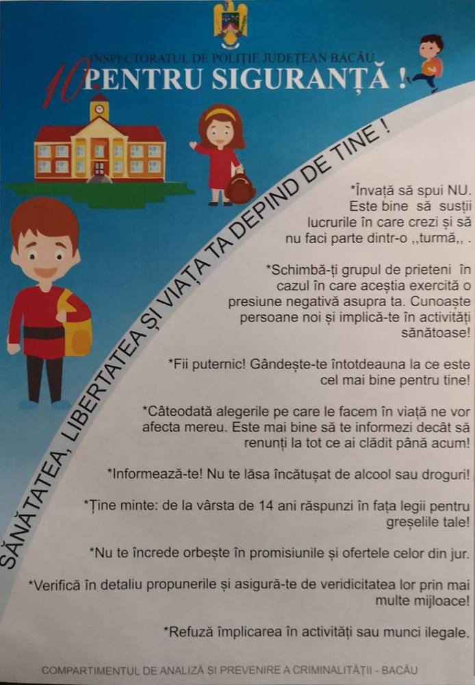 Având în vedere că siguranţa în şcoli constituie o prioritate pentru Inspectoratul de Poliţie Judeţean Bacău, poliţiştii, în parteneriat cu unităţile de învăţământ vor acţiona pentru îmbunătăţirea siguranţei şcolare, pentru prevenirea evenimentelor negative şi evitarea comportamentelor de risc victimal sau infracţional.
