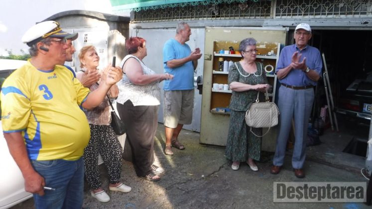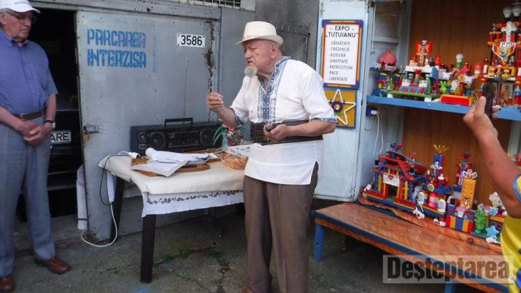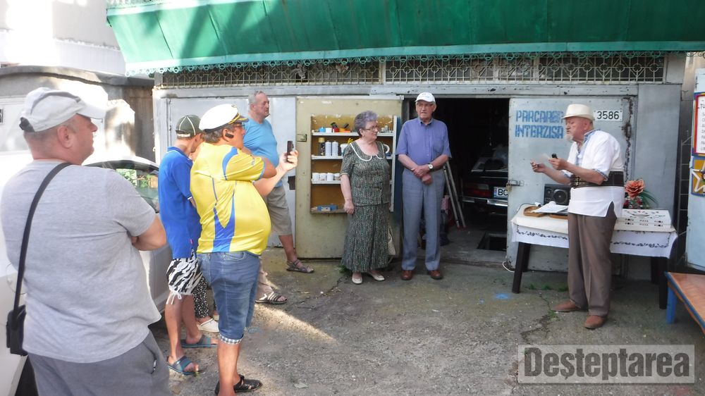 Un moment emoţionant pentru Aurel Ţuţuianu, colonel în rezervă, care locuieşte de foarte mulţi ani pe strada Bucovinei, în blocul 4. Îmbrăcat cu o ie, cu chimir, vesel, bucuros de oaspeţi, pe care i-a invitat în faţa garajului lui de lângă bloc, unde se mai află şi acum Dacia cumpărată în anii ’70, direct din fabrică, de culoare neagră, care avea, la început, un număr format din trei cifre. Pe o măsuţă improvizată, a aşezat diferite produse de cofetărie şi de la marketul de peste drum, o carafă cu vin alb, „din producţie proprie”, scoasă din beciul de sub garaj.