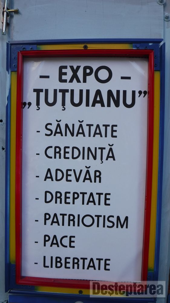 „În faţa dumneavoastră se află un om născut, hăt, hăt…în 1934. Astăzi, 5 iulie, 2019, împlinesc 85 de ani. Am ieşit la pensie pe 8 mai, acum 30 de ani. În aceşti ani, m-am gândit că, deoarece nu beau, nu fumez, nu mă duc la jocuri de noroc, m-am gândit să fac ceva plăcut, util şi frumos, o expoziţie, pe care am denumit-o «EXPO Ţuţuianu», pe care o arăt publicului pentru prima dată. Expoziţia mea, pe care o vedeţi aici, se bazează pe mai multe concepte: Sănătate, Credinţă, Adevăr, Dreptate, Patriotism, Libertate. Ele pot fi luate în orice ordine vreţi, pot fi concentrate, însă toate la un loc presupun o viaţă în democraţie. Noi avem democraţie, însă cam bolnavă şi un capitalism cam sălbatec. Vă mulţumesc că aţi venit la sărbătorirea zilei mele de naştere şi vă invit să vizionaţi expoziţia.”