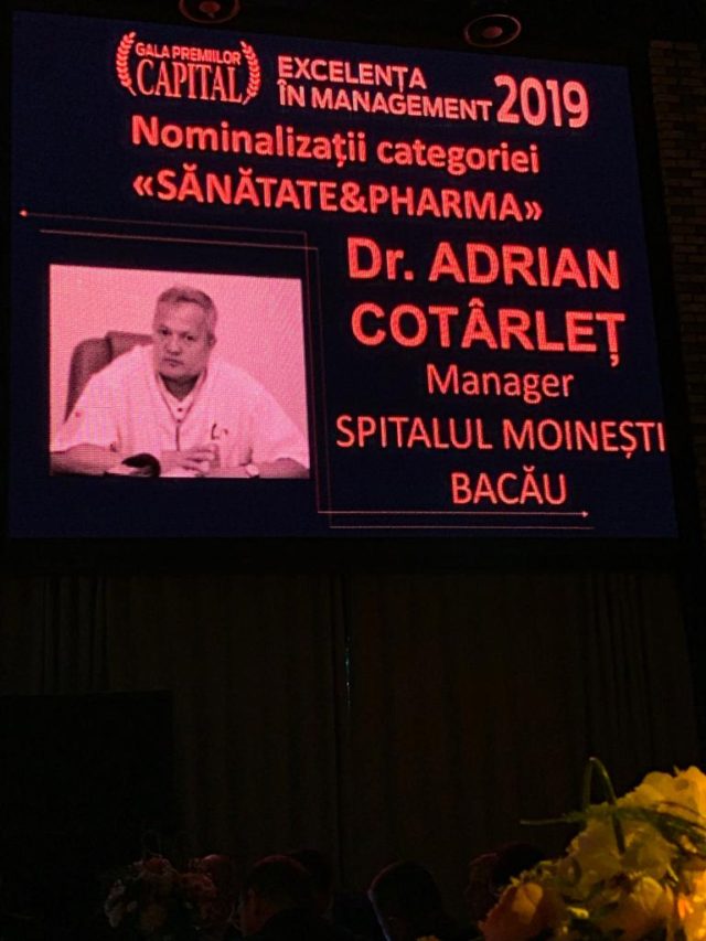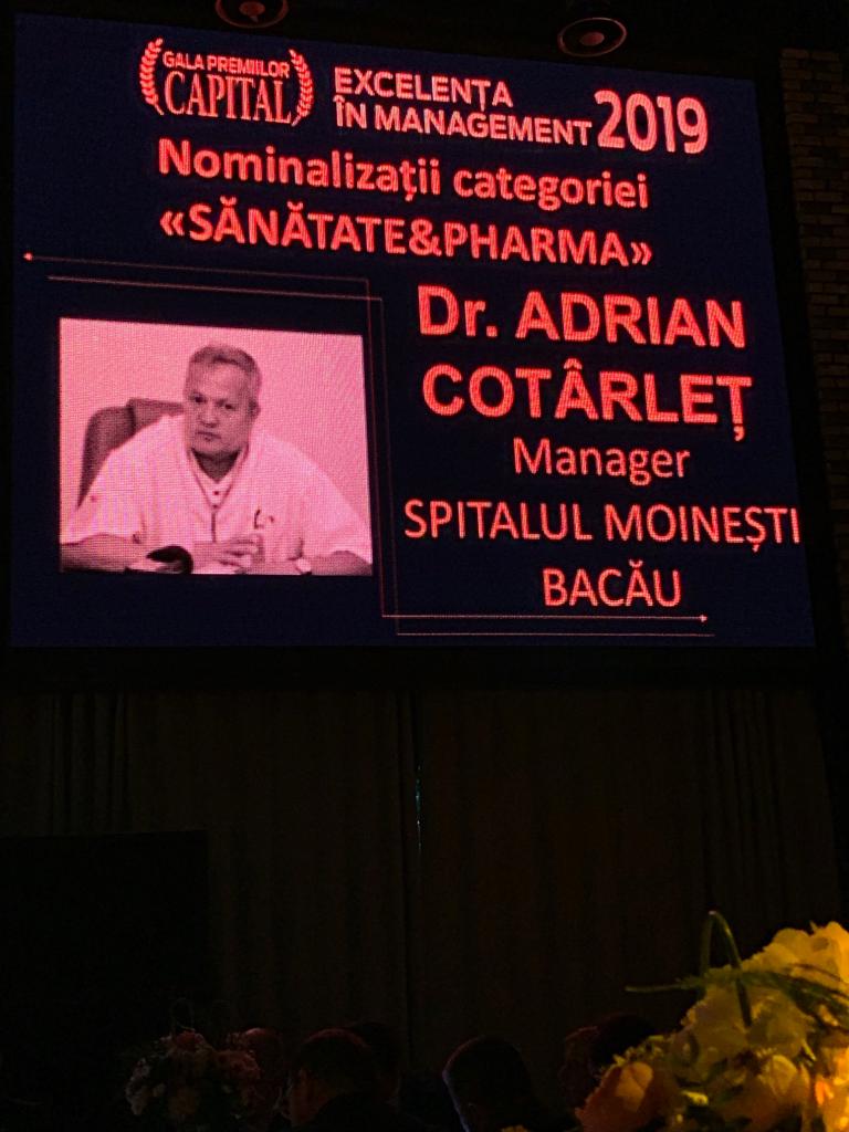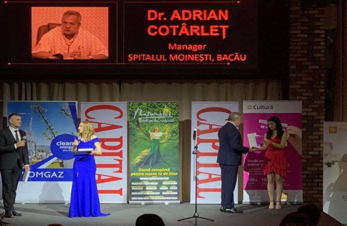 Directorul Spitalului Municipal de Urgență din Moinești, dr. Adrian Cotârleț, a fost premiat, marți seară (25 iunie) la Gala Premiilor de Excelență în Management 2019, organizată de revista Capital. Adrian Cotîrleț a fost nominalizat la categoria „Cei mai bun manageri din Sănătate și Pharma”.