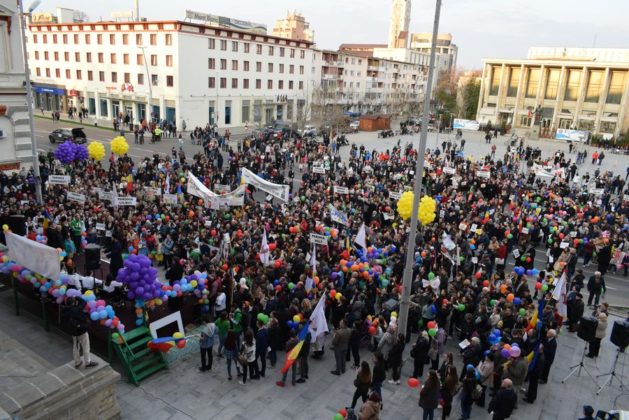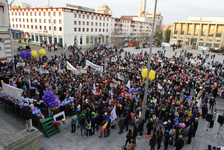 În Piața Tricolorului așteptau alți participanți la această manifestare iar după joncțiunea tuturor, masa de oameni s-a adunat în jurul unei scene amplasate în fața Palatului Administrativ.