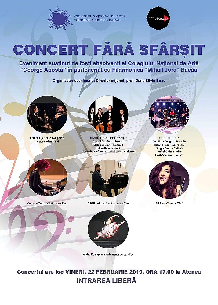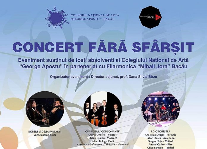 Vineri, 22 februarie, la sala Ateneu a Filarmonicii Mihail Jora din Bacău va avea loc o nouă ediție a «Concertului fără sfârșit» organizat de Colegiul Național de Artă „George Apostu”.