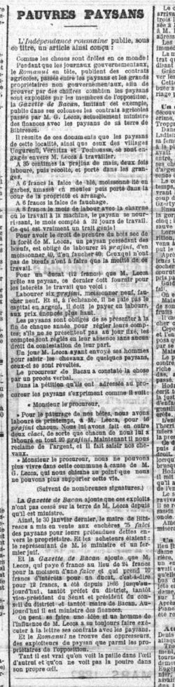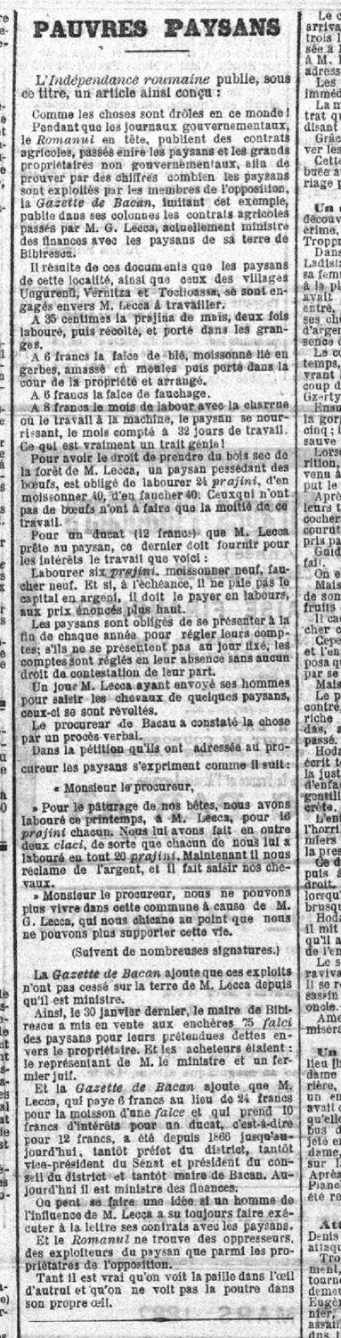Citând „Gazeta de Bacău”, ziarul francez da ca exemplu înțelegerile forțate de proprietarul moșiei Bibirești, nimeni altul decât ministrul de finanțe Gheorghe Lecca. Ziarul scrie despre prețurile extrem de mici stabilite pentru munca țăranilor, dar și despre abuzuri.