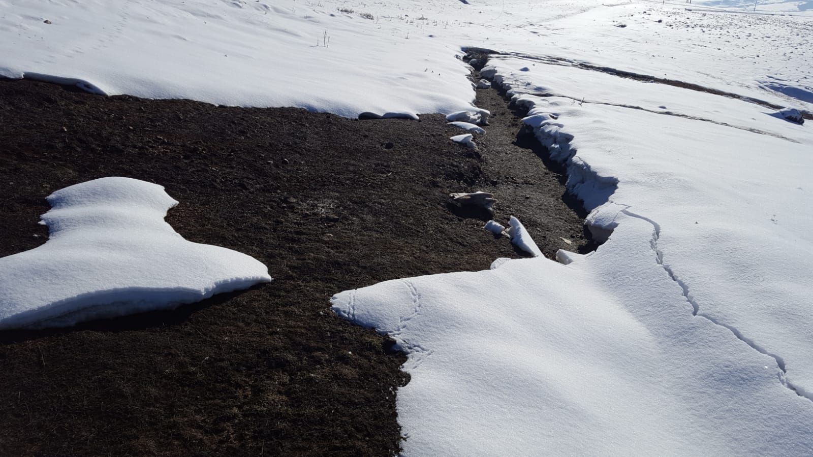În fotografiile făcute la fața locului nu se mai vede apă curgând, ci numai făgașul prin care a curs deja apa și a topit stratul de zăpadă, pentru că s-a oprit alimentarea cu apă a conductei după ce operatorii au văzut că a scăzut presiunea în urma avariei.