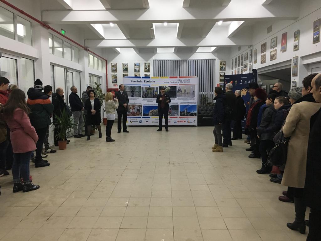 În prima zi, în cochetul hol al Casei de Cultură, a avut loc vernisajul expoziției „România-Evoluție”, o ediție specială realizată pentru Centenarul Marii Uniri. Andrei Giurgia, carismaticul manager-România al proiectului, a spus, la vernisajul expoziției: „Cinematografia este un personaj potrivit pentru înțelegerea istoriei, a culturii, a evenimentelor, a psihologiei și a durerilor unui popor. Astfel, celebrăm împlinirea a 100 de ani de la Marea Unire prin Centenarul Filmului Românesc și aducem istoria românilor pe marele ecran. Critici de film, regizori, politologi, specialiști din diverse domenii ale culturii au ales 100 de filme pe care le-am dus/ le vom duce în 100 de localități din România, Republica Moldova și Cernăuți. Filmele au fost/ sunt/ vor fi vizionate și discutate, în sesiuni de Q&A, cu 100 de personalități de seamă ale cinematografiei și ale culturii. Am pornit la drum în Caravana Cinematografică a Centenarului, pentru a întregi harta României Mari.