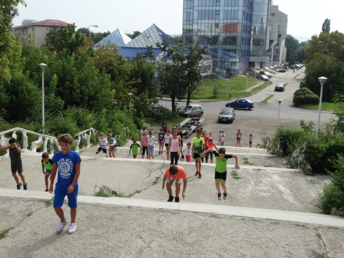 În zona scărilor de la Universitatea „George Bacovia”, o altă gașcă de copii urca scările sărind. Erau supravegheați de un…antrenor. Oare ce sport practică aceștia? Dacă nu-i cunoști n-ai să ghicești never. Sunt înotători. De la CS Nautica și CSM Bacău.