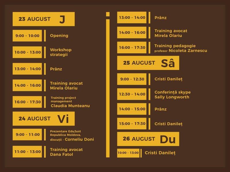 Sesiune de lucru, în aceste zile În aceste zile, începând de ieri, 22 august, și până pe 26 august, în Bacău are loc sesiunea de lucru pentru propunerea unor direcții ale unui program de educație juridică ce se vrea a fi implementat în mai multe comunități. Cei 25 de participanți au fost aleși în urma unui proces de selecție ce a avut în vedere motivația și experiența acestora.