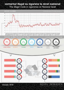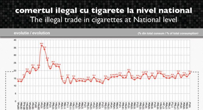 Piața neagră a țigaretelor a crescut în iulie la 18,2% din totalul consumului (cu 2,1 p.p. mai mult față de mai 2018). Este cel mai ridicat nivel al contrabandei din acest an, depășind media din 2017, de 16%.