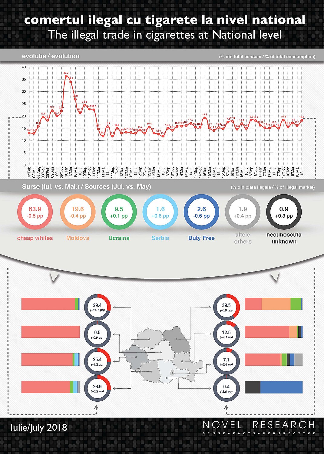 „Regiunea nord-est continuă să fie cea mai afectată de piața neagră, cu o pondere de 39,5%, deși comerțul ilicit cu tigarete pare să fi luat cu asalt partea de vest a țării. Cea mai importantă creștere se înregistrează în nord-vest, 14,7 p.p., până la 29,4%, regiunea ajungând, astfel, la un nivel record în ultimii trei ani! În plus, comerțul ilegal crește cu 6,2 p.p. până la 26,9% și în regiunea sud-vest. Din punct de vedere al provenienței, „cheap whites” continuă să fie principala sursă, cu 63,9%. Ponderea produselor din tutun provenite ilegal din Moldova, Ucraina și Serbia este relativ constantă”, a declarat Marian Marcu, Director General Novel Research.