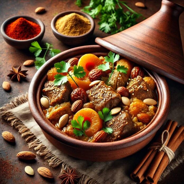 Călește ceapa în ulei de măsline într-un vas tagine sau o oală adâncă. Adaugă carnea, sarea, piperul, scorțișoara și șofranul; rumenește timp de 5 minute. Adaugă apă cât să acopere carnea, apoi lasă la fiert 1-2 ore la foc mic. Adaugă caisele, mierea și migdalele în ultimele 20 de minute de gătire. Servește decorat cu coriandru proaspăt și semințe de susan.