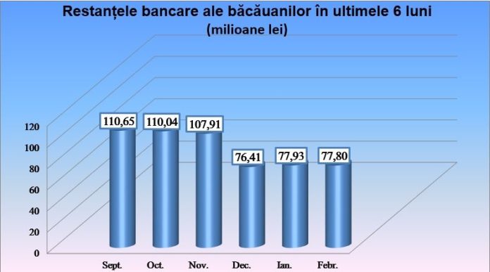 Restanțele bancare ale băcăuanilor au început din nou să scadă, după o creștere de peste 1,5 milioane de lei în ianuarie. Luna trecută, restanțele erau mai mici cu aproape 134.000 de lei față de luna precedentă și au ajuns la 77, 79 de milioane de lei.