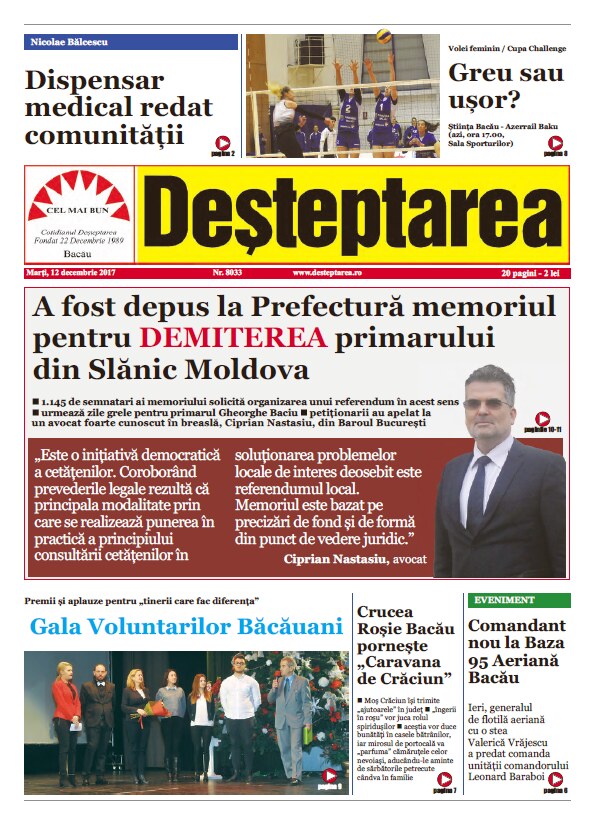Luni, la prânz (11 decembrie), la Registratura Instituției Prefectului din Bacău a fost depus un memoriu prin care 1145 de cetățeni ai orașului stațiune Slănic Moldova, înscriși în listele electorale, solicită declanșarea procedurii de organizare a unui referendum pentru demiterea primarului Gheorghe Baciu. Memoriul are 27 de pagini și cuprinde motivele pentru care a fost conceput și depus. Petiționarii au apelat la un avocat foarte cunoscut în breaslă, Ciprian Nastasiu, din Baroul București. În termen de 30 de zile, conform legii, petiționarii așteaptă soluționarea cererii lor.