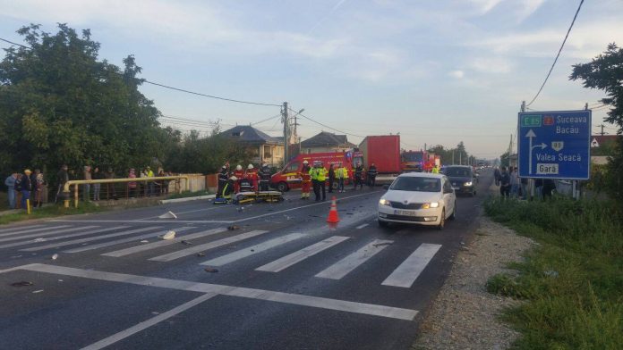 În urma impactului, camionul care oprise la trecere a fost proiectat în faţă şi l-a acroşat pe pieton, după care ambele autovehicule au părăsit partea carosabilă, ajungând în curtea unei locuinţe.