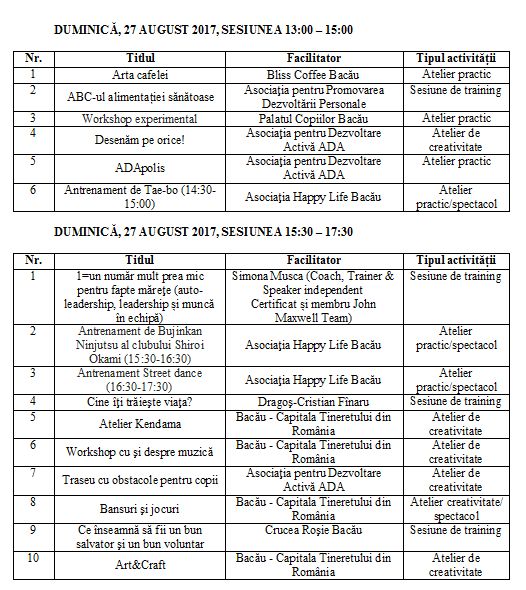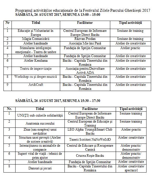 Sâmbătă și duminică, 26-27 august, în intervalul orar 13.00 – 22.00, în parcul Gherăiești vor avea loc activități educaționale: ateliere creative, demonstrații, sesiuni de training, ateliere practice și jocuri, activități sportive: crossuri de alergat și pe bicicletă, demonstrații de Bujinkan Ninjutsu și Tae-Bo, zumba etc și activități culturale: mini concerte, spectacole de dans, teatru etc, dar și multe alte surprize.