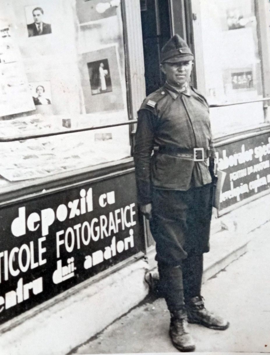 Ultima fotografie, poate cea mai simbolică, îl arată pe același bărbat – sau un camarad de-al său – în uniformă militară de campanie, în fața unui magazin inscripționat „Depozit cu articole fotografice pentru amatori”. Panourile din vitrină expun portrete și clișee, iar ironia subtilă a cadrului nu poate fi trecută cu vederea: un soldat, în mijlocul războiului, fotografiat tocmai în fața unui loc dedicat memoriei și imaginii. Zâmbetul discret și privirea încrezătoare sugerează o speranță – poate pentru o reîntoarcere acasă, poate pentru o lume mai liniștită.