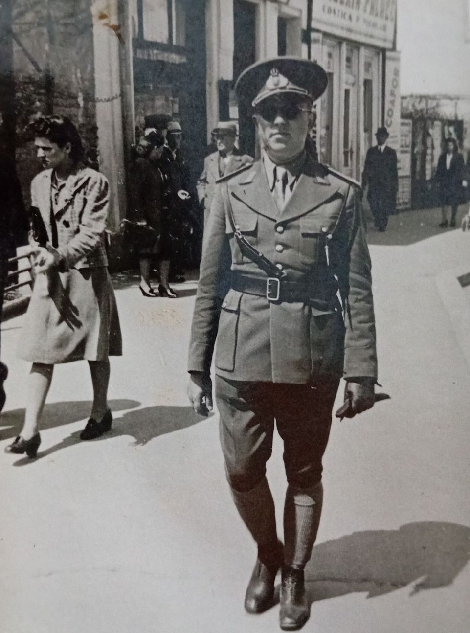 A doua imagine, realizată probabil tot în centrul orașului, arată un ofițer român într-o uniformă perfect aliniată, pășind încrezător pe trotuarul unei străzi animate. În spatele lui se pot citi numele unor prăvălii băcăuane – „Costică & Tănase”, „Coafor modern” – mărturii ale unui oraș viu, modern, în pas cu moda vremii. Ofițerul poartă ochelari de soare și chipiu cu însemne regale, semn al perioadei interbelice târzii sau al începutului celui de-al Doilea Război Mondial. În jurul lui, trecătorii, femeile cu pălării elegante și domnii în costume închise la culoare completează tabloul unei epoci dispărute.