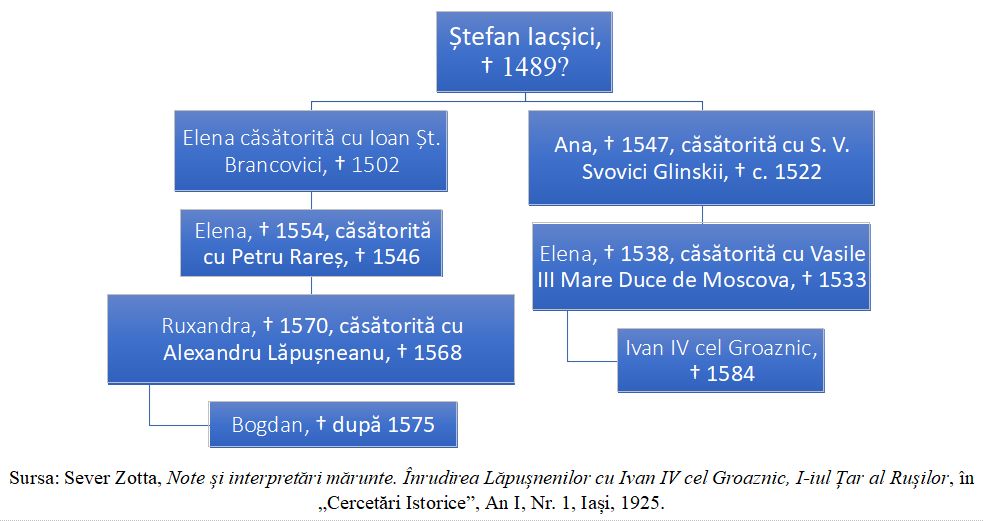 Sursa: Sever Zotta, Note și interpretări mărunte. Înrudirea Lăpușnenilor cu Ivan IV cel Groaznic, I-iul Țar al Rușilor, în „Cercetări Istorice”, An I, Nr. 1, Iași, 1925.