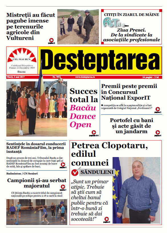 3 mai 1967 (4 pag., 25 de bani). Pe prima pagină, nelipsita poezie, semnată acum de Constantin Donea. Mare demonstraţie a oamenilor muncii, care alegorice, coloane ale elevilor şi copiilor, un fluviu de oameni trece prin faţa tribunei, cu lozinci mobilizatoare, iar pe fundal fotografiile „celor nouă”, membri ai Biroului Politic, primul era Ceauşescu.