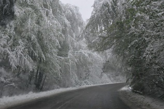 Atenţie sporită pentru şoferii care traversează dealul Măgura! Crengile copacilor încărcaţi de zăpadă ameninţă să se rupă şi să ajungă pe şosea.