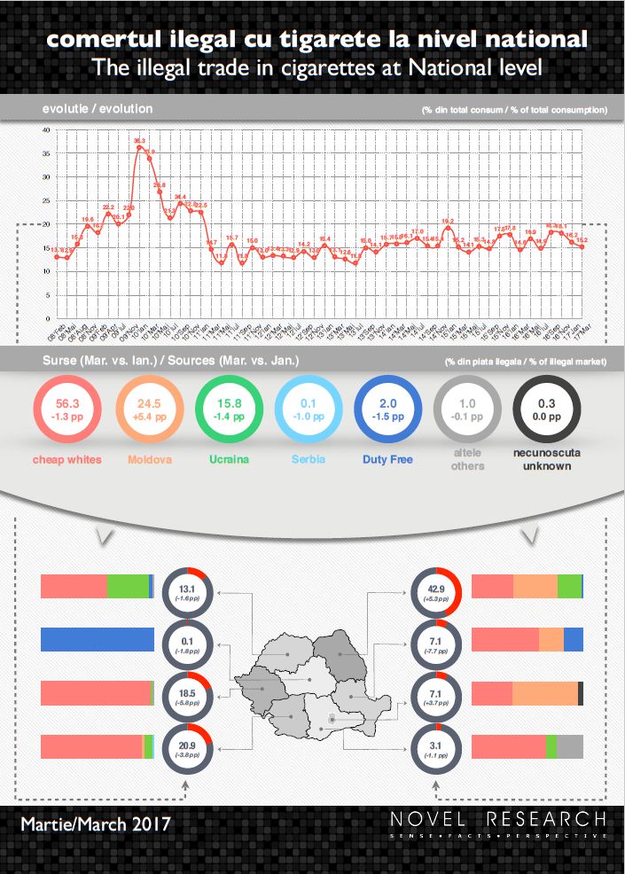 „Regiunea nord-est rămâne și în martie 2017 cea mai afectată de comerțul ilegal cu țigarete, cu 42,9%, procentul fiind în creștere cu 5,3 p.p. față de ianuarie 2017. Regiunile vest și sud-vest continuă să înregistreze în martie 2017, un nivel ridicat al comerțului ilicit (18,5%, respectiv 20,9%), cu toate că cifrele sunt în scădere față de ianuarie. Cea mai substanțială scădere a pieței ilicite se înregistrează în partea de sud-est a țării. Din punct de vedere al provenienței, categoria „cheap whites” continuă să dețină și în martie cea mai mare pondere (56,3%), urmată de produsele provenite din Moldova (24,5%, în creștere cu 5,4 p.p. comparativ cu ianuarie 2017) și Ucraina (15,8%, în scădere cu 1,4 p.p.). Ponderea produselor provenite din Serbia se situează la 0,1%, în scădere cu 1 p.p. față de începutul anului 2017”, a declarat Marian Marcu, Director Novel Research.