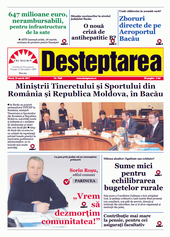 Sala mare a Consiliului Județean (CJ) a fost arhiplină luni, la ședința ordinară aferentă lunii martie fiind prezenți toți consilierii, toți șefii de servicii, direcții și instituții din subordine, dar și ai altor organizații și instituții din județ. Președintele Sorin Brașoveanu a evocat două întâlniri importante, una care a marcat împlinirea a 99 de ani de la unirea Basarabiei cu România și alta de la CAEx, cu UNICEF și miniștrii Tineretului din Republica Moldova și România, apoi a intrat în ordinea de zi. După câteva proiecte care au vizat asocieri ale județului cu alte structuri în vederea susținerii unor activități, au urmat aprobarea bugetului CJ Bacău și repartizarea banilor către cele 93 de primării. La primul proiect, Sorin Brașoveanu a precizat că prioritară rămâne finalizarea modernizării Aeroportului, urmată de investițiile din Sănătate.