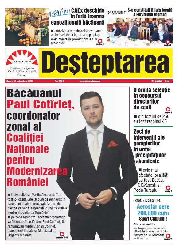 Intâlnire de pionierat in Bacau. Aula Universitatii „Vasile Alecsandri” a fost gazda unei prime reuniuni in teritoriu a Coalitiei Nationale pentru Modernizarea României (CNMR), in cadrul caruia a fost prezentat si bacauanul Paul Cotirlet, care a fost numit coordonator zonal al acestei organizatii. Un eveniment de elita, la care au participat presedintele CNMR, Alexandru Cumpanasu (cunoscut si ca realizatorul emisiunii „Ambasador România”), Mihai Vasile, presedinte al Asociatiei pentru Dezvoltarea Durabila, Pregatirea Profesionala si Asistenta Sociala, reprezentanti de seama ai societatii civile din Bacau, Dragos Benea, in calitate de presedinte de partid, dar si fost presedinte de Consiliu Judetean, Sorin Brasoveanu, actualul presedinte al Consiliului Judetean Bacau, Cosmin Necula, primarul Municipiului Bacau, directori de institutii publice, primari din comunele si orasele judetului, personalitati de marca din mediul de afaceri, mediul academic, medical, politic si administrativ.