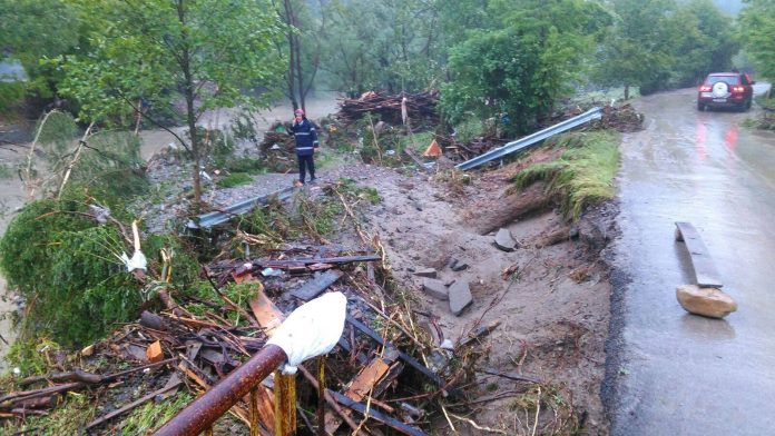 în localitatea Slănic Moldova, drumul judeţean DJ 116 a fost blocat cu lemne şi aluviuni. Zona a fost degajată de Serviciul Voluntar pentru Situaţii de Urgenţă, care a acţionat cu șase voluntari, un buldoexcavator şi o autospecială de intervenţie;