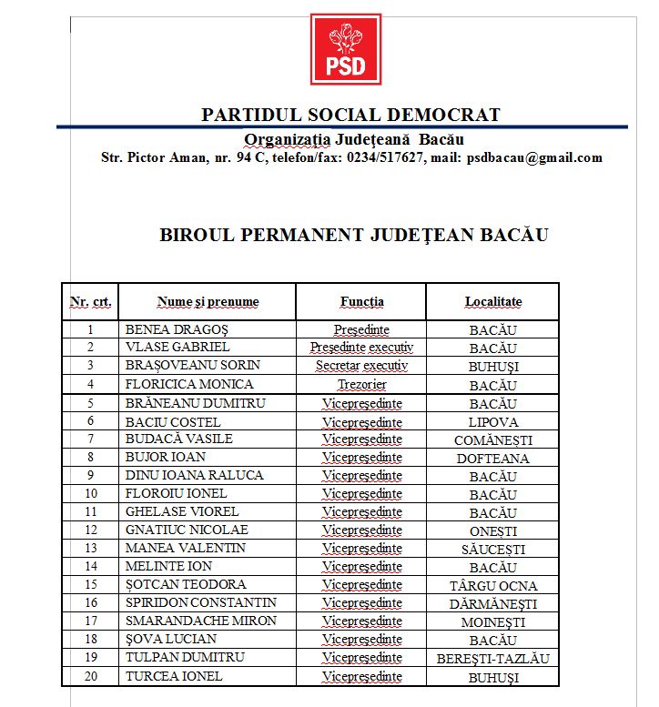 Conferința Organizației Județene a PSD Bacău întrunită în plen astăzi, 26 septembrie 2015, având în vedere alegerea președintelui PSD cu ocazia scrutinului intern programat pentru a avea loc în 11 octombrie 2015 își exprimă: