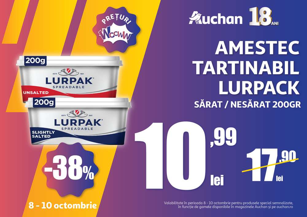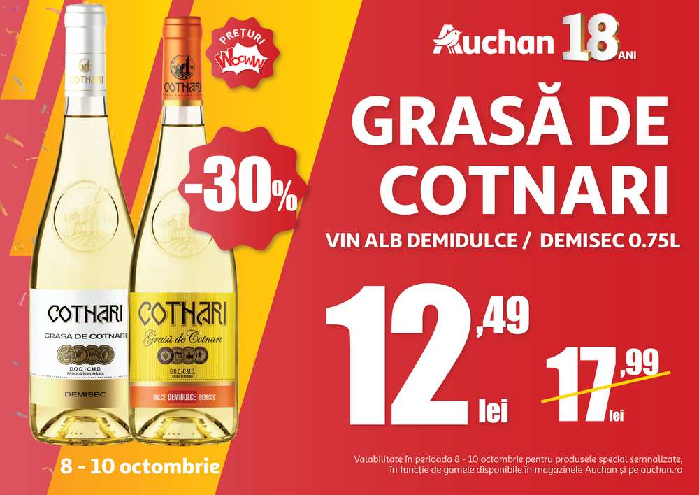 Luna octombrie marchează 18 ani de la deschiderea primului magazin Auchan România, iar clienții sunt așteptați în magazine pentru o sărbătoare de oferte WooWW! Până pe 22 octombrie, la Auchan ai parte de peste 1.000 de reduceri substanțiale și beneficii suplimentare prin cardul de fidelitate MyCLUB Auchan, iar noi vă prezentăm mai jos cele mai interesante oferte din perioada 8-10 octombrie.