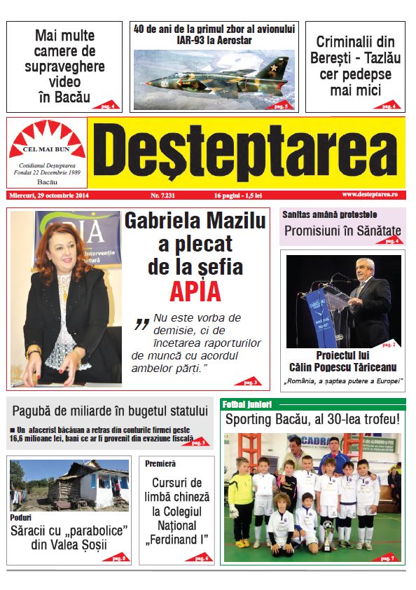 Sa se inteleaga faptul ca nu este vorba de demisie, ci de incetarea raporturilor de munca cu acordul ambelor parti. Pe de alta parte, am luat aceasta decizie inainte de evenimentul alegerilor din 2 noiembrie, tocmai pentru a nu se face speculatii pe acest subiect.” Gabriela Mazilu, directorul in functie al APIA Bacau