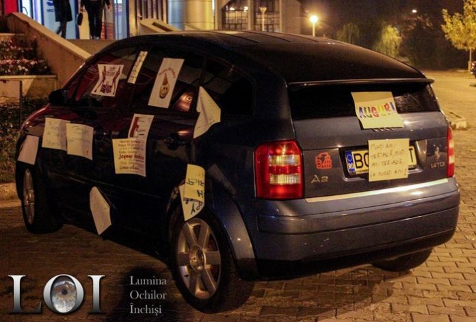 Nu este vorba, cum s-ar parea la prima vedere, de o razbunare a unui sofer ramas fara locul de parcare, ci de o masina acoperita cu urari de „La Multi Ani”, din partea prietenilor.