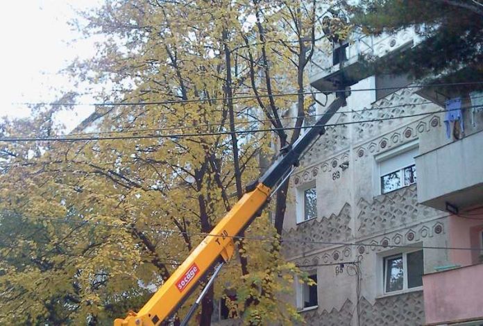Bacauanii care locuiesc pe strada Carpati din municipiul Bacau s-au trezit luni dimineata cu zgomot de drujba la ferestre. La blocul nr. 16 de pe strada amintita, fusese montata o mini-macara, iar un muncitor taia de zor crengile unui copac.