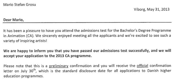 Va trimitem in atasament documentul care atesta admiterea fiului nostru la Facultatea de animatie din Viborg, Danemarca.