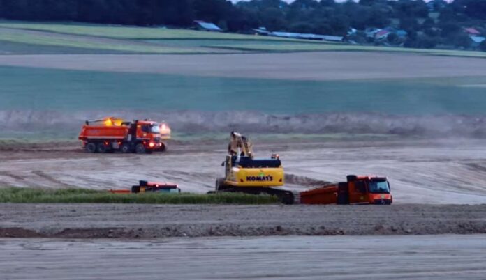 Filmare aeriană a șantierului nodului rutier Mogoșești, de pe tronsonul lotului 3 Bacău – Pașcani al Autostrăzii A7. Acest nod rutier este prevăzut la circa 10 km de la „intrarea” autostrăzii în județul Iași. Geometria este de tip „Trompetă”, cu raze ale bretelelor de 250 m, fiind asigurată o viteză de proiectare de 60Km/h cu descărcare în DJ208. Trompeta descarcă traficul print-o bretea într-o intersecție giratorie la DJ208. Nodul este amplasat pe raza UAT Hălăucești.