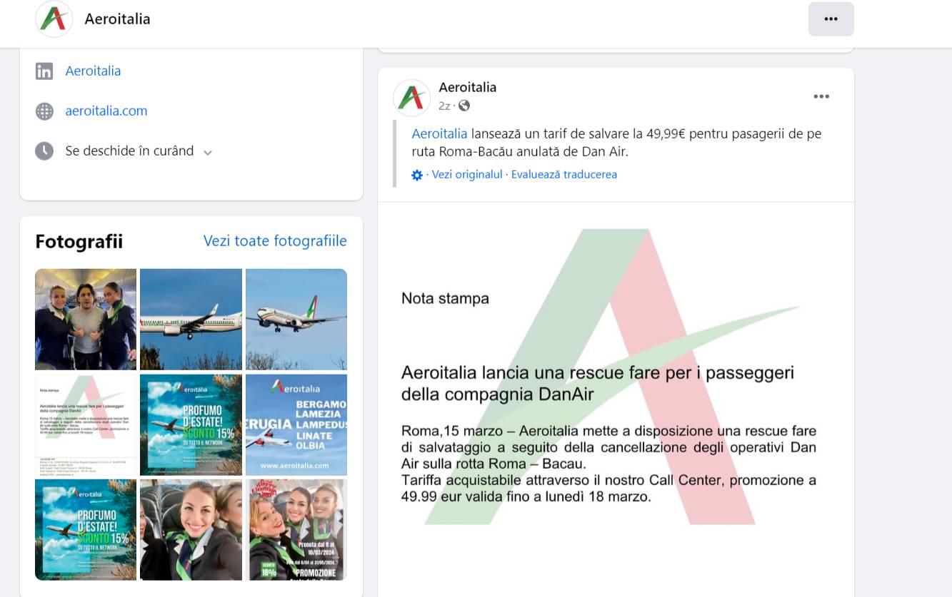 Totul a început când AeroItalia a anunțat că lansează un „tarif de salvare” incredibil de scăzut, de doar 49,99€, pentru pasagerii afectați de anularea cursei Roma-Bacău de către Dan Air. Însă, reacția nu a întârziat să apară.