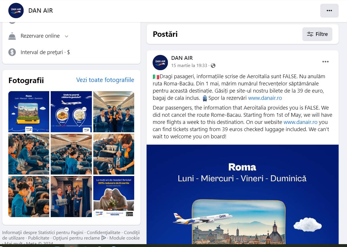 Dan Air a catalogat imediat informația ca fiind falsă și a asigurat că ruta Roma-Bacău nu va fi anulată, ci dimpotrivă, se vor mări frecvențele săptămânale începând cu data de 1 mai. Cu un ton ferm, compania a menționat că pe site-ul său biletele sunt disponibile deja de la 39 de euro, inclusiv bagaj de cală.