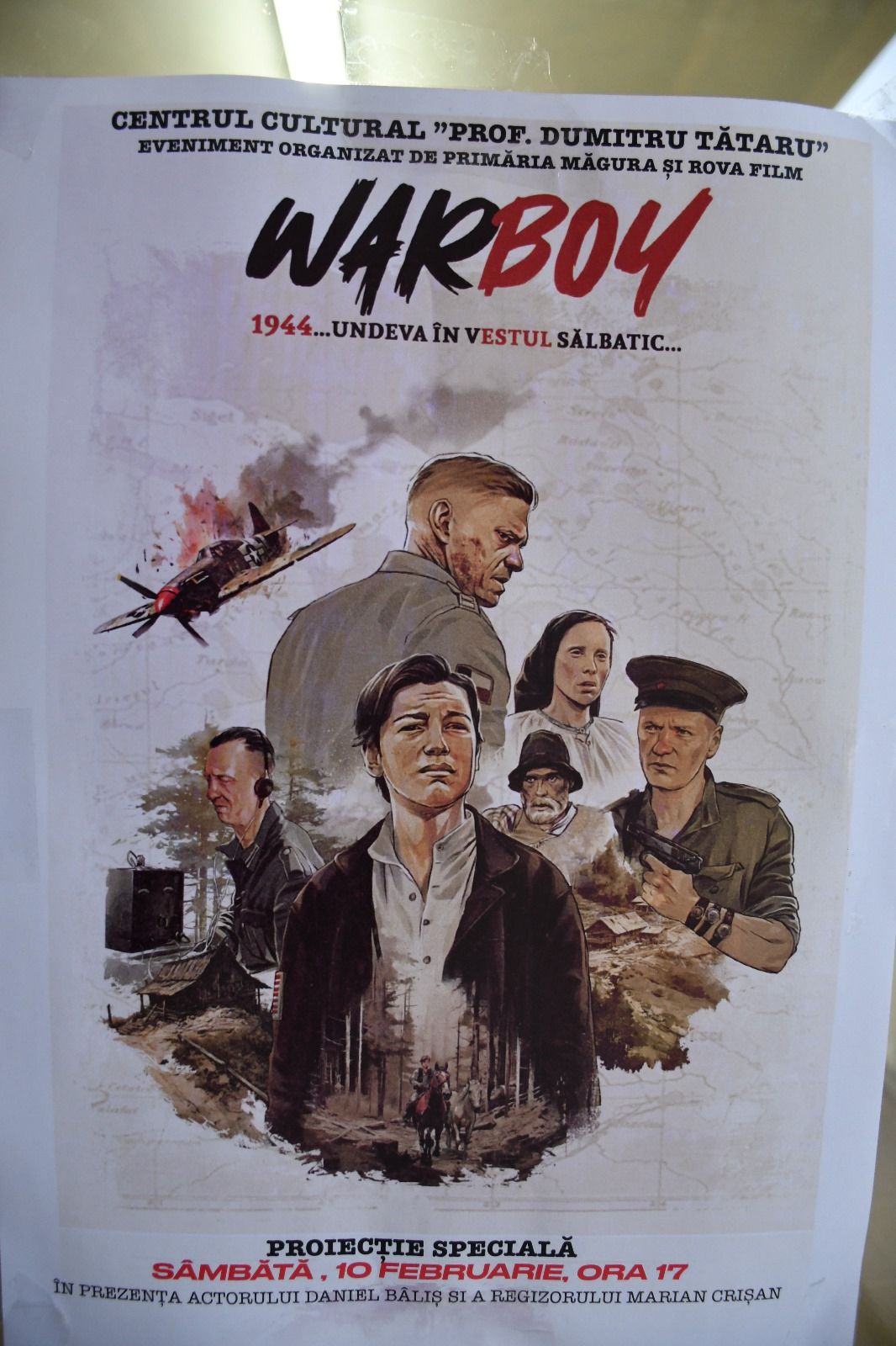 Povestea Warboy ar putea fi rezumată în 25 de cuvinte, ca în legendele despre prezentările scenariștilor în fața finanțatorilor de la Hollywood. Așadar, în 1944, un adolescent ardelean și un aviator american, constrânși de împrejurări, călătoresc împreună, cu doi cai, prin Apuseni, ca să ajungă într-un loc sigur. Dezvoltând un pic, fără a povesti în amănunt – deoarece vă lăsăm plăcerea de a viziona filmul la Teatrul de Vară, în martie -, mai spunem că filmările sunt senzaționale, regizorul Marian Crișan impresionând atât prin tehnica filmării, cât mai ales prin frumusețea cadrelor naturale alese, el fiind un fiu al acelor locuri din Apuseni. Jocul actorilor – la fel, convingând în momente gândite în a fi de mare emoție; și trebuie să spunem că în afară de Daniel Bâliș, toți ceilalți de pe generic erau profesioniști, ceea ce a scos în evidență talentul nativ al măgureanului nostru! Inclusiv caii, ireal de arătoși, erau „profi”! Tensiunea acțiunii, pe fondul unei lente călătorii prin păduri, a fost bine menținută de regizor, astfel că în fiecare clipă te întrebai „oare ce va urma?”. A fost o preocupare permanentă a regizorului de a recrea în mod realist condițiile războiului, de la colibe, case, port popular, uniforme militare, arme, modul de a vorbi al tuturor celor implicați – țărani, militari germani, români sau sovietici -, ajungând la lipsa eroismului inutil (cine este mare fan ”Rambo” sau al altor producții de pac-pac să nu se uite la Warboy), dar și la modificările de comportament și de caracter cauzate tuturor de războiul nemilos. Un film care te pune pe gânduri și care cere imperios o continuare. Publicul simte asta!