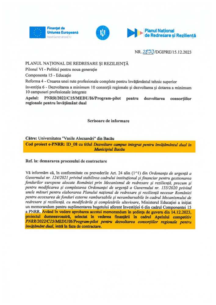 Prin implementarea sistemului de învățământ dual, sute de tineri vor avea oportunitatea de a dobândi cunoștințe și abilități practice, pregătindu-se pentru provocările pieței muncii. Campusul integrat va asigura nu doar educație de calitate, ci și conexiuni strânse între teorie și practică, pregătind astfel o mână de lucru înalt calificată pentru județul Bacău.