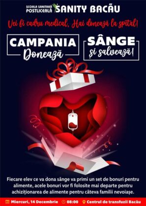 – 14 Decembrie 2023 la Centrul de transfuzii Bacău va avea loc Campania Donează sânge și salvează!! O campanie ce a ajuns anul acesta la cea de a 4-a ediție. Scopul acestei campanii este de a salva câteva vieți prin donarea de sânge și de a ne folosi în scop caritabil de bonurile primite în schimbul donației de sânge. Cu bonurile primite, elevii donatori de sânge vor achiziționa alimente și dulciuri pentru copii din medii defavorizate.