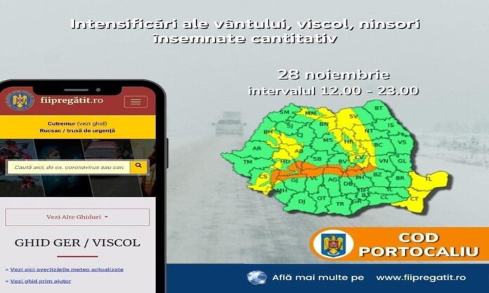 De asemenea, în intervalul 28 noiembrie, ora 10:00 – 29 noiembrie, ora 08:00, la munte, mai ales la altitudini de peste 1500 m, se anticipatează ninsori semnificative cantitativ, cu depunere de strat nou de zăpadă. Cantitățile de apă vor fi local de 20…35 l/mp, iar vântul va avea intensificări, cu rafale în general de 60…75 km/h, existând riscul de intervale cu viscol și vizibilitate redusă.