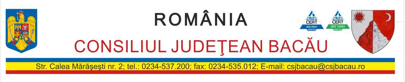 Consiliul Judeţean Bacău în şedinţă ordinară pentru data de 29.11.2023, ora 10,00 în sala mare de şedinţe a Consiliului Județean Bacău, cu următorul proiect al ordinii de zi: