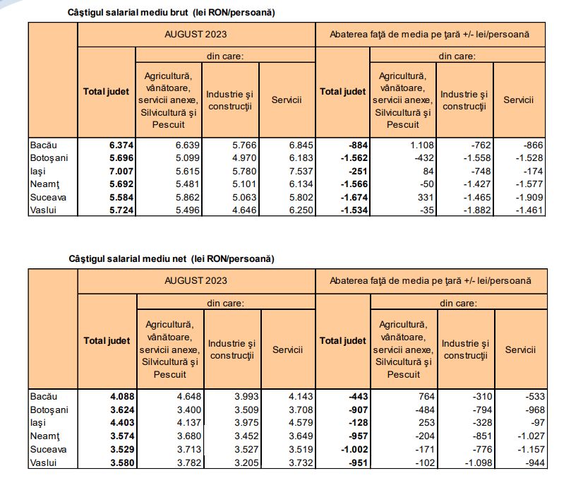 Câștigul salarial mediu brut în județul Bacău a fost de 6.374 lei (RON) per persoană în august 2023, conform Direcției Județene de Statistică.