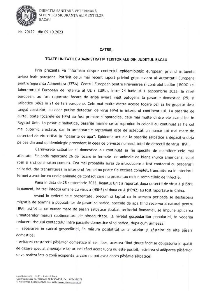 Direcția Sanitară Veterinară și pentru Siguranța Alimentelor din Bacău adresează o notificare urgentă către toate unitățile administrativ-teritoriale din județul Bacău cu privire la situația epidemiologică europeană referitoare la gripa aviară înalt patogenă.