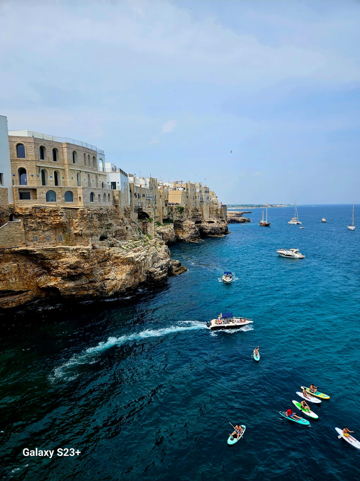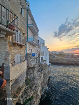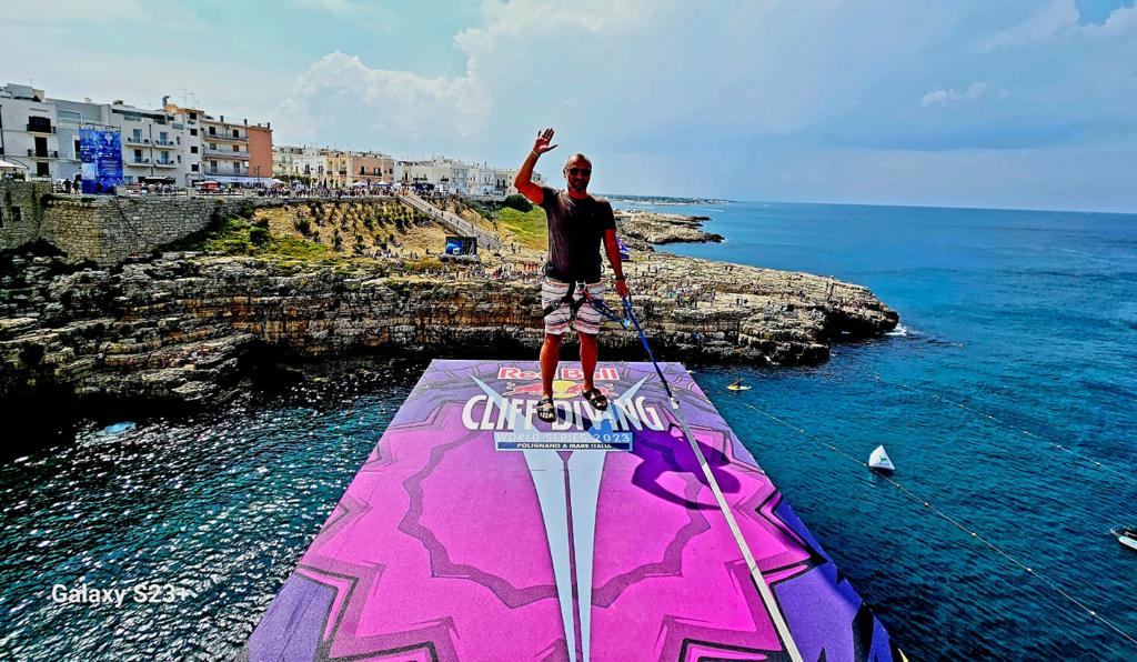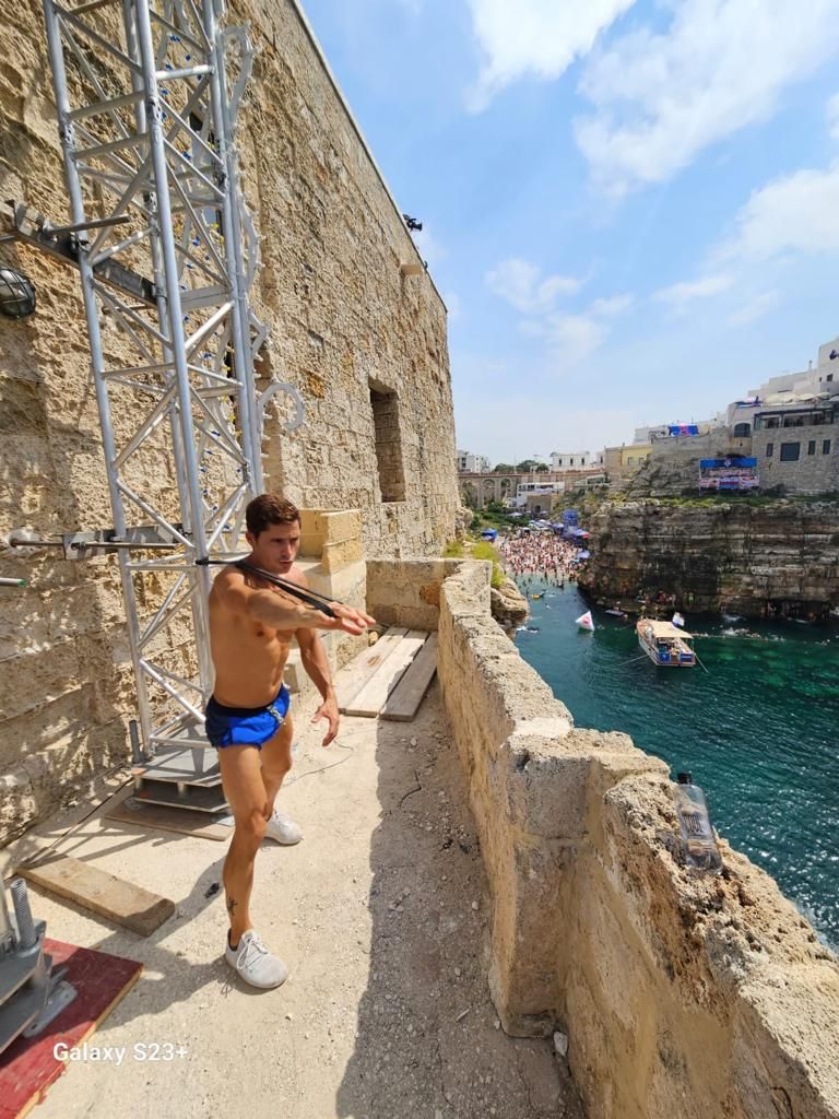 Domenico Modugno stă cu mâinile în lături, cu cămașa descheiată la piept și cu haina fluturându-i statutar. Mimi se află cu spatele la marea albastră, albastră precum cerul ce l-a inspirat să scrie acel „Nel blu dipinto di blu” clasat pe locul 1 în 1958 la Festivalul de la Sanremo. Primul cantatutor din istorie premiat la Sanremo s-a născut aici, la Polignano a Mare. O afli repede. Nu trebuie să consulți Wikipedia. Ți-o spune statuia sa, aflată chiar pe lungomare Modugno și ți-o repetă cafenelele sau restaurantele intitulate „Volare”, după refrenul nemuritorului „Nel blu dipinto di blu”. Ți-o arată posterele și ți-o cântă tonomatele de pe stradă. Polignano a Mare este, așadar, Domenico Modugno. Dar nu numai. Anual, câteva sute de mii de turiști străini vizitează această localitate de nici 18.000 de locuitori aflată la 30 kilometri sud de Bari. De altfel, în ianuarie 2023, Polignano a fost votată pe site-ul booking.com drept cea mai primitoare localitate din întreaga lume. În „cea mai primitoare localitate din lume”, turiștii ascultă muzica lui Modugno, se rătăcesc, fără griji, pe străduțele pline de poezie și, atunci când nu fac plajă, se avântă în mici croaziere. Mănâncă, la prețuri rezonabile, pește, fructe de mare și, cu precădere, caracatiță („il polpo” reprezintă captura de bază în această zonă a Pugliei) și beau „caffe originale”: coajă de lămâie, Amaretto, frișcă și cafea. Un deliciu! În fine, cumpără suveniruri din ceramică: în special „pumo” (sau, după caz, „pomo”), un boboc de trandafir purtător de noroc ce-și datorează numele Pomonei ,zeița romană a fructelor și florilor. Din 2009, Polignano a Mare mai are un atu. Și încă unul-magnet. Aici se desfășoară etapa italiană a celei mai spectaculoase întreceri de sărituri în apă de la mare înălțime: Red Bull World Series Cliff Diving. În 2017, atunci când a triumfat italianul Alessandro De Rose, au venit nu mai puțin de 75.000 de oameni! Costa Popovici era prezent: „Mi s-a făcut piele de găină când publicul a început să scandeze numele câștigătorului”. Anul acesta, Polignano a găzduit a zecea sa ediție. Iar spectatorii, veniți de peste tot din lume, nu au ratat evenimentul.