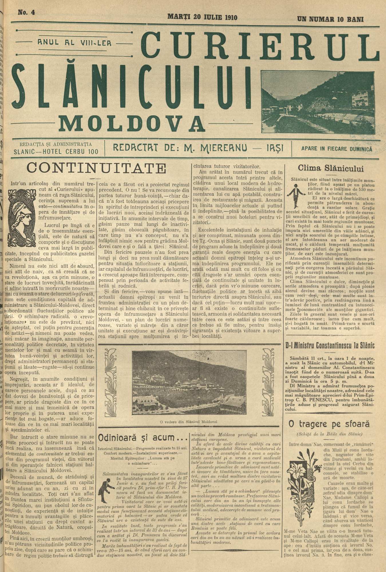 Contiuăm prezentarea serialului dedicat ziarului ,,Curierul Slănicului Moldova” (din colecția Bibliotecii Centrale Universitare ,,Mihai Eminescu” din Iași – BCU), primul din România care a oglindit viața unei stațiuni balneare. În fapt, un jurnal al stațiunii Slănic-Moldova care acoperă o perioadă istorică mai puțin cunoscută publicului larg, cea din perioada ,,La Belle Époque”; un model peste timp de promovare a turismului balnear al „Perlei Moldovei”, așa cum a fost denumită stațiunea pentru prima dată, chiar de către acest ziar.